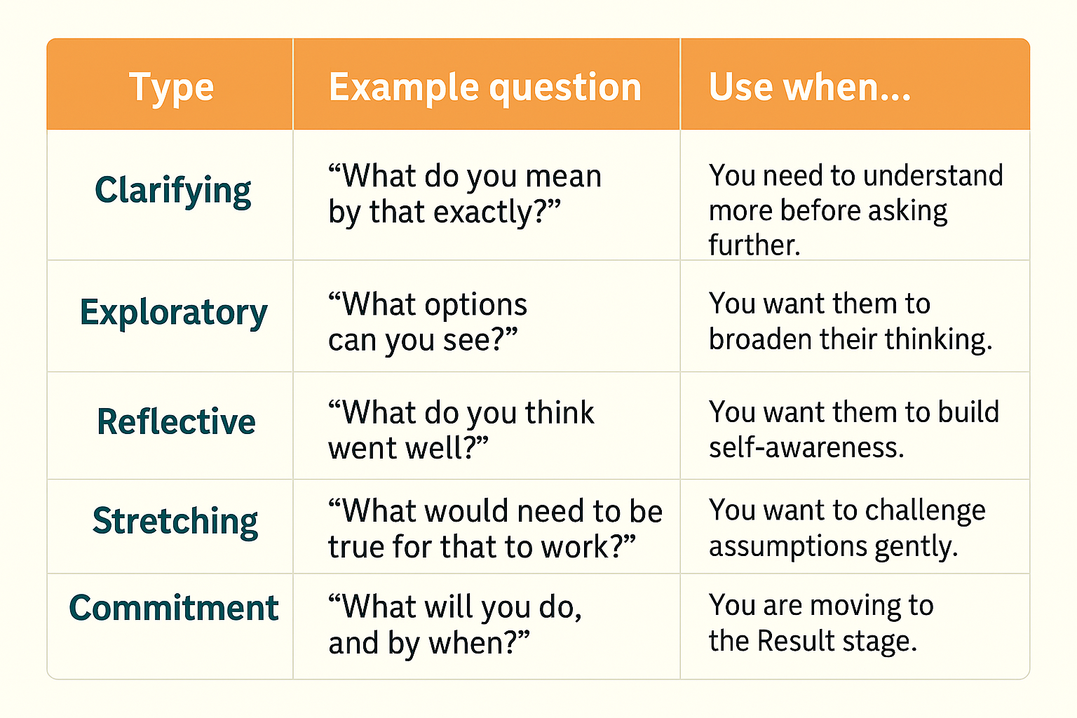 The reference card below is designed to be your quick companion in the moment.  Before a 1-2-1, a team meeting, or an ‘oh, can I just pick your brains?’ conversation, glance at it to remind yourself of the core moves at each stage of STAR.