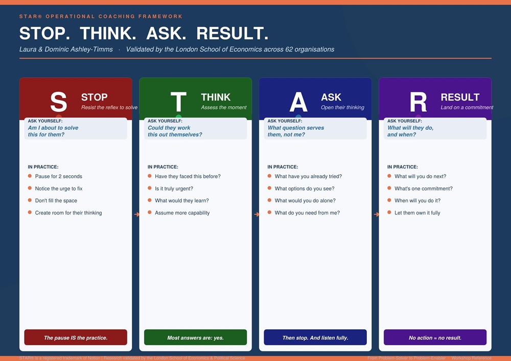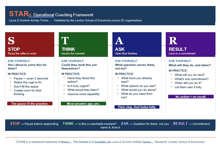 The information below is derived from the STAR® operational coaching framework:  STOP. THINK. ASK. RESULT.Laura and Dominic Ashley-Timms. Validated by the London School of Economics across 62 organisations.